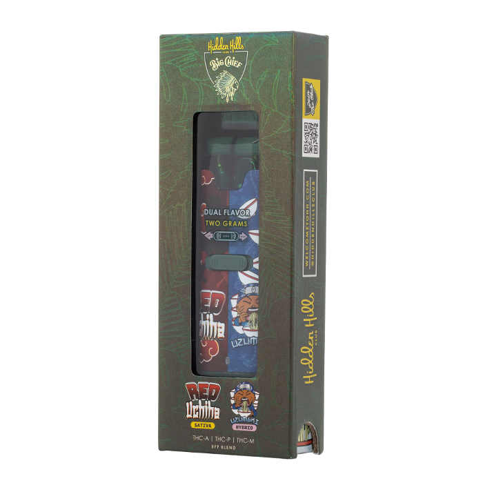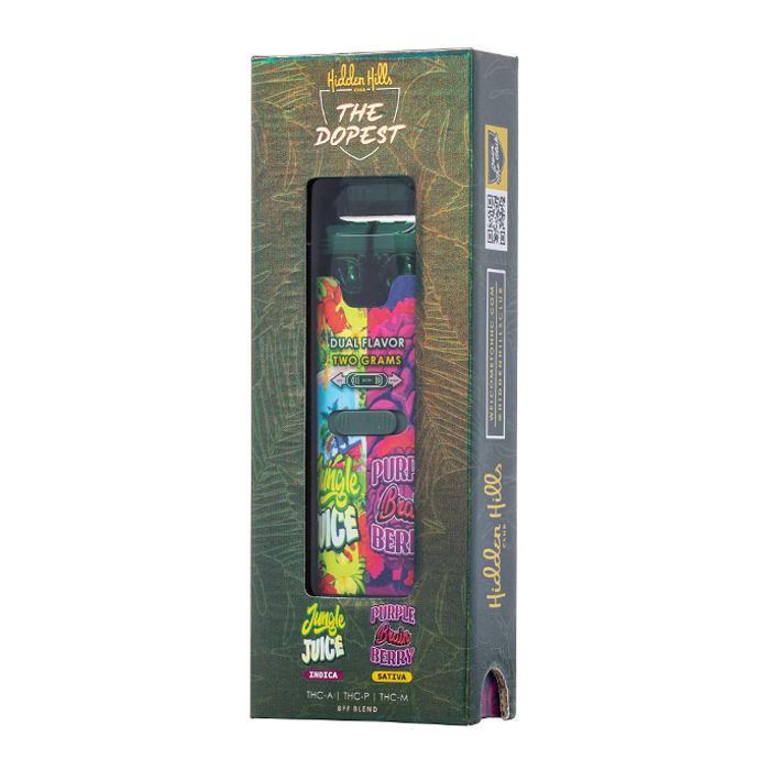 Echa un vistazo al Hidden Hills & Friends BFF Blend Dual-Flavor Disposable 2G, que contiene THC-A, THC-P y THC-M en un vaporizador desechable de precalentamiento con dos tanques de 1 gramo llenos de concentrado de las principales empresas de cannabis.